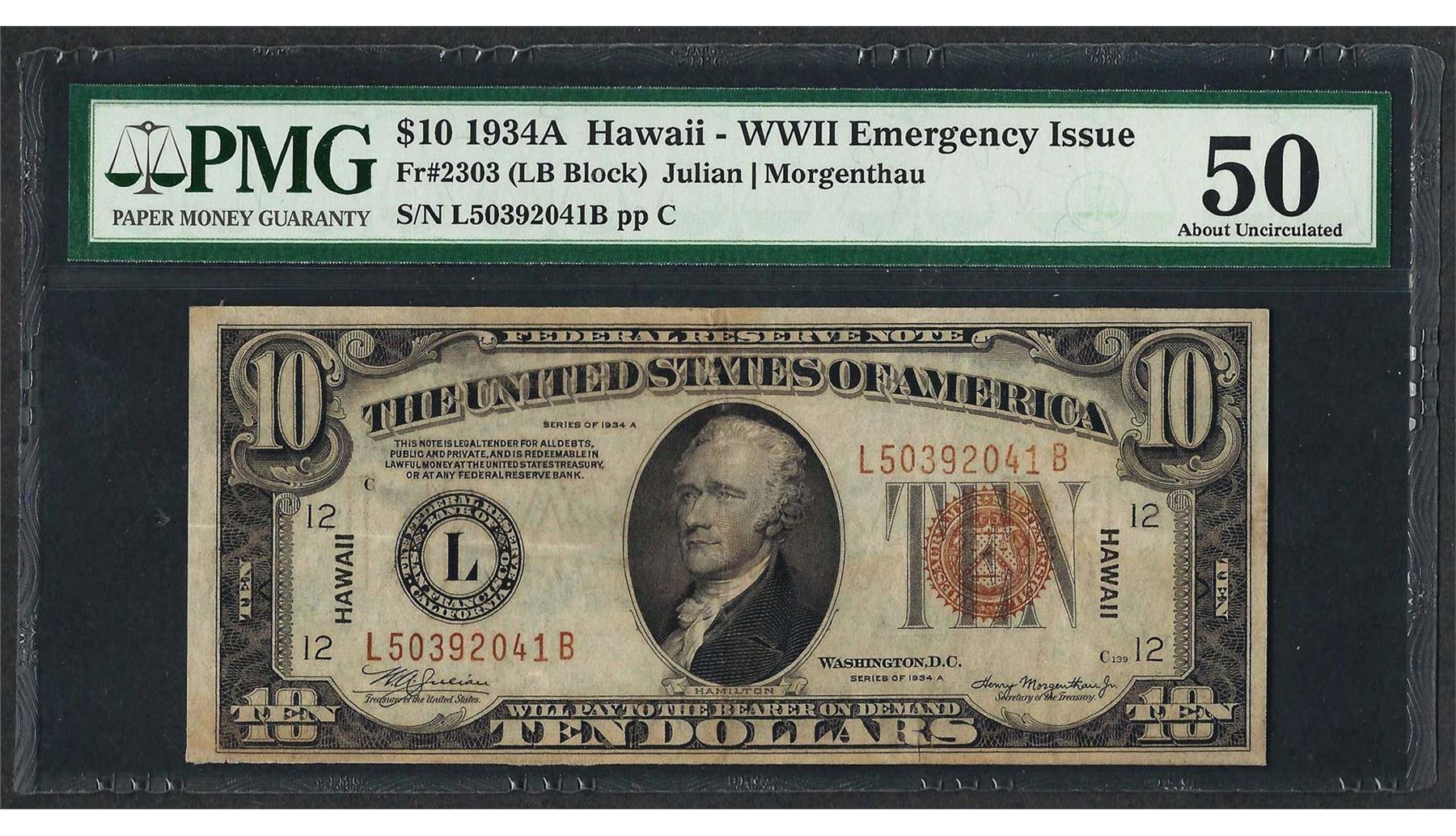 One 1934A $10 Hawaii Federal Reserve WWII Emergency Note Fr.2303 PMG About Uncirculated 50. PMG Certified.