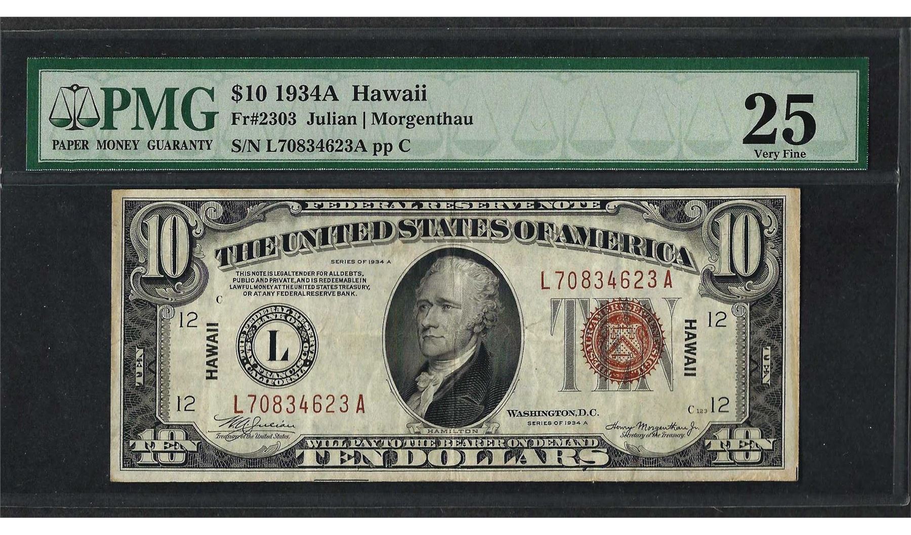 One 1934A $10 Hawaii Federal Reserve WWII Emergency Note Fr.2303 PMG Very Fine 25. PMG Certified.