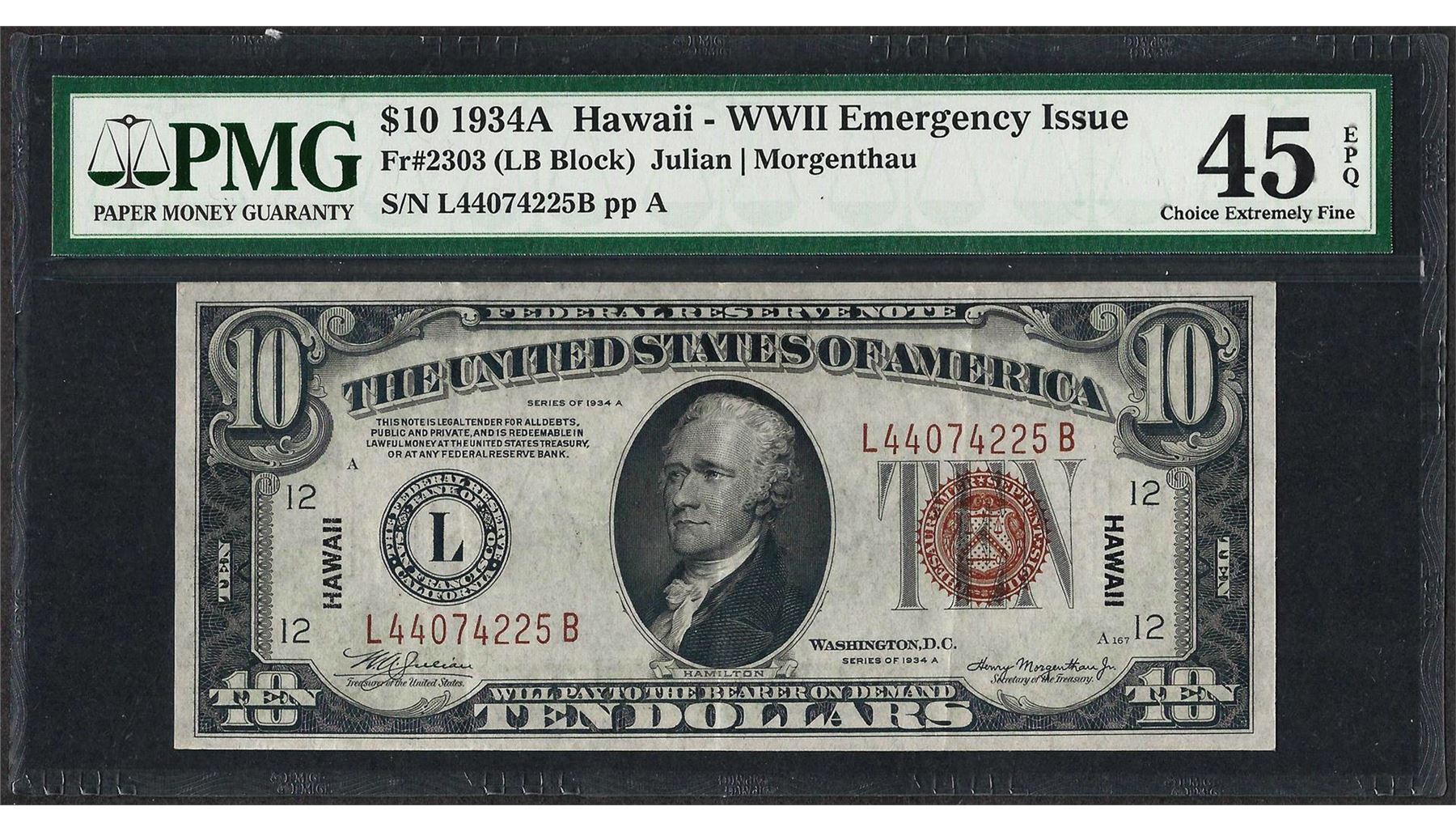 One 1934A $10 Hawaii WWII Emergency Issue Federal Reserve Note Fr.2303 PMG Ch. Extremely Fine 45EPQ. PMG Certified.