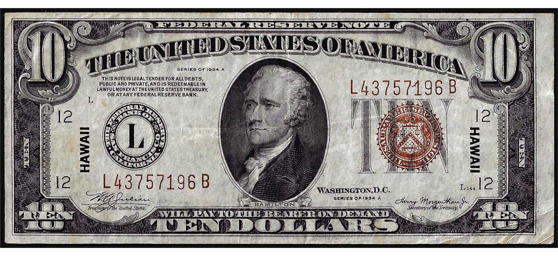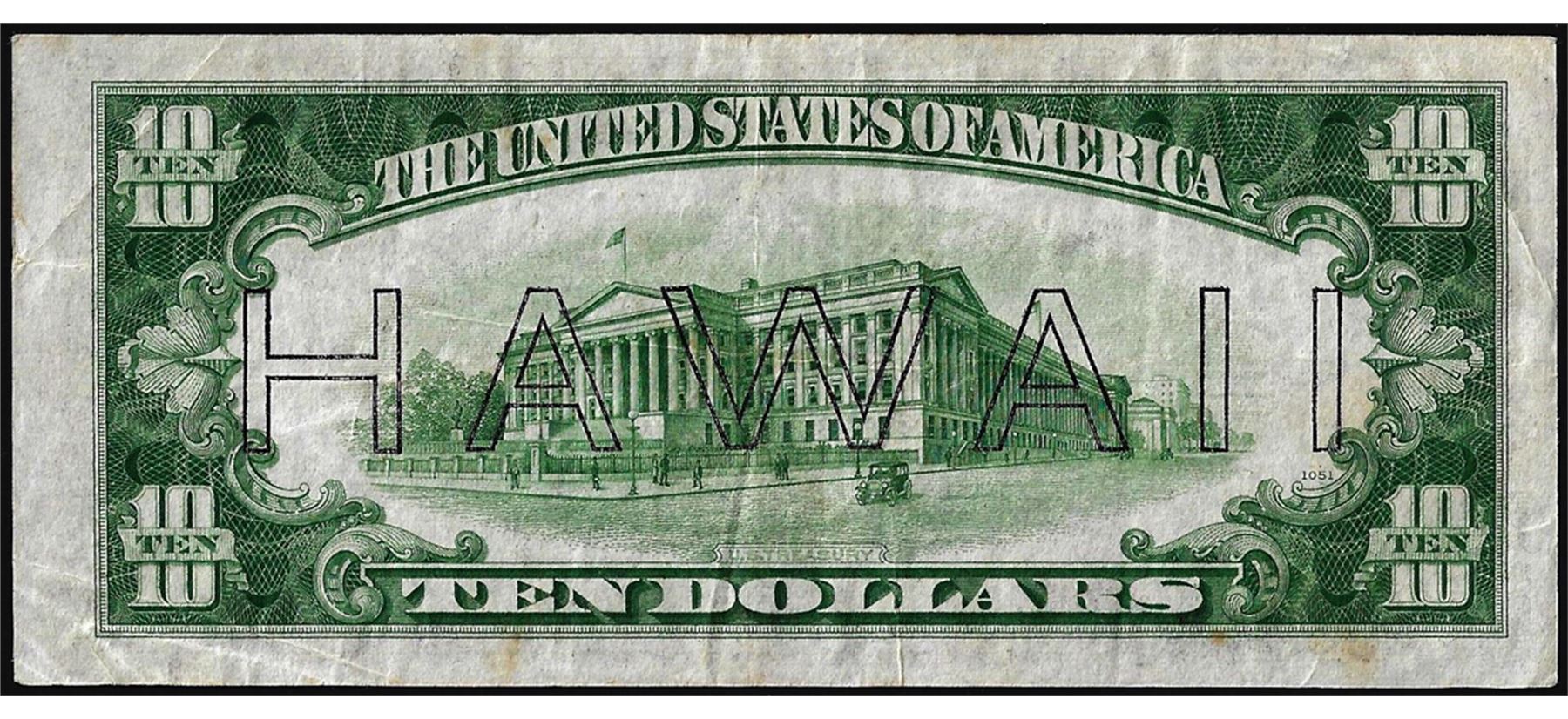 One 1934A $10 Hawaii WWII Emergency Issue Federal Reserve Note.