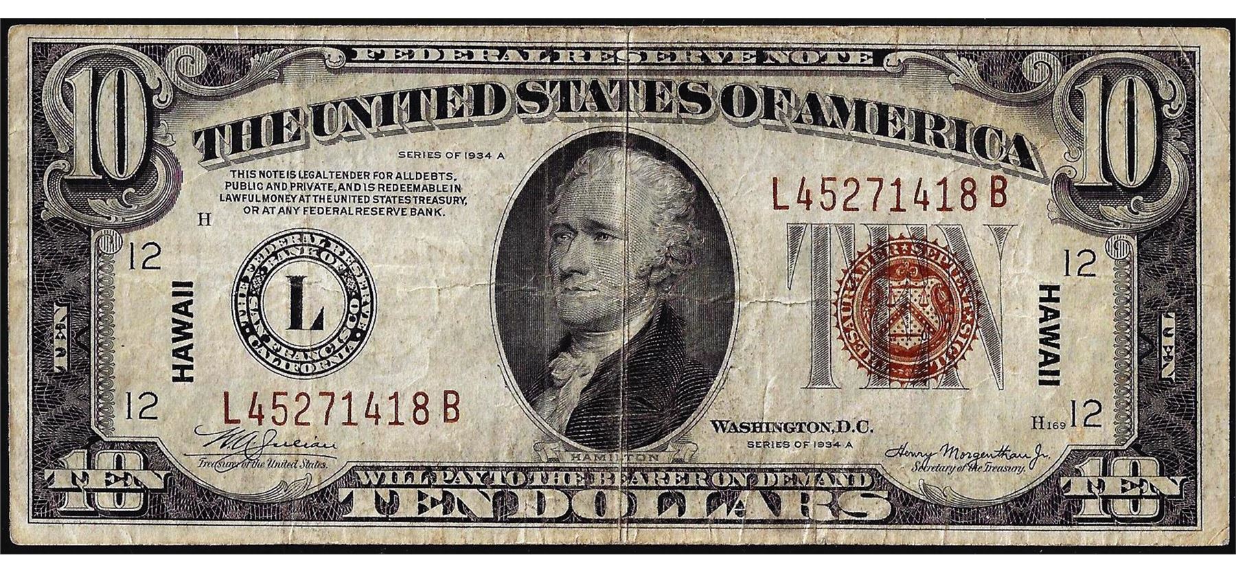 One 1934A $10 Hawaii WWII Emergency Issue Federal Reserve Note.