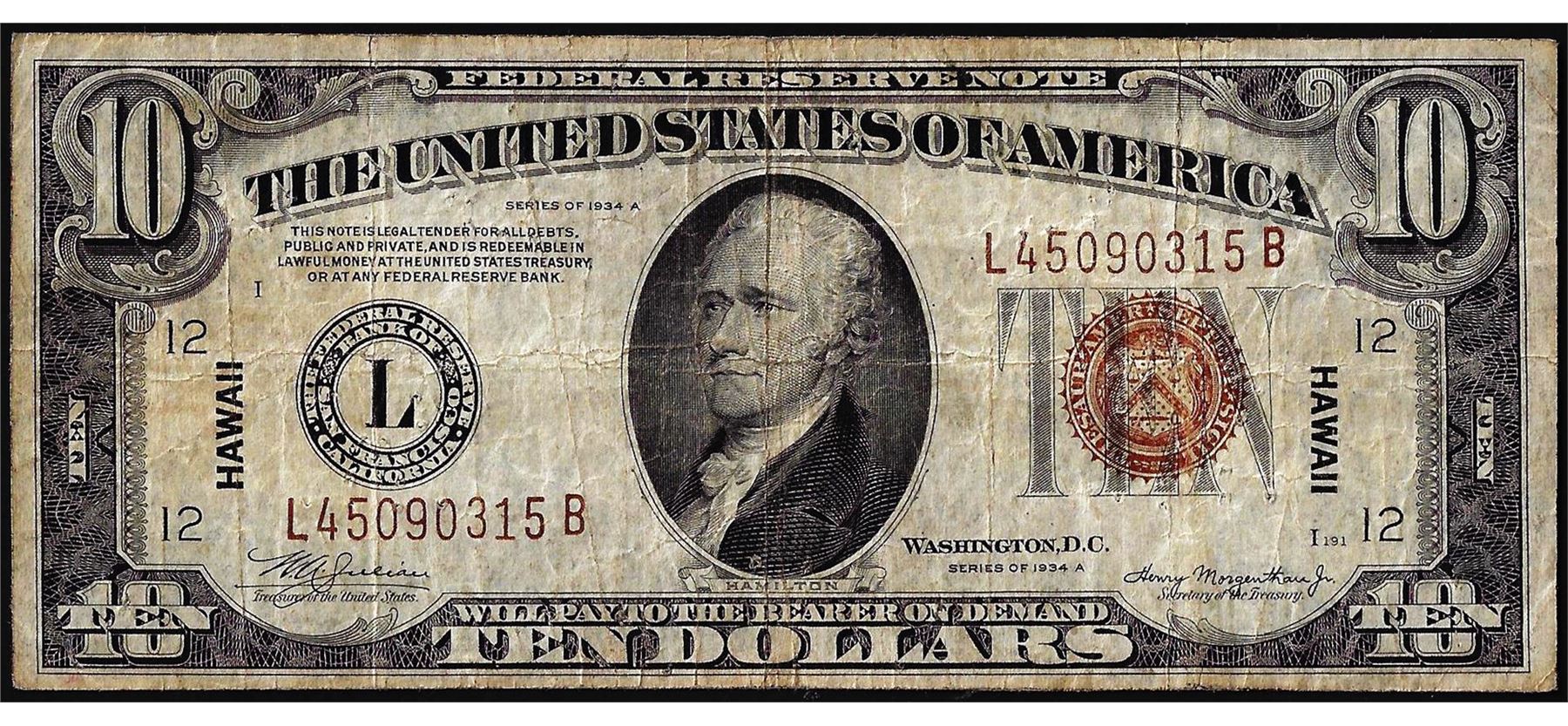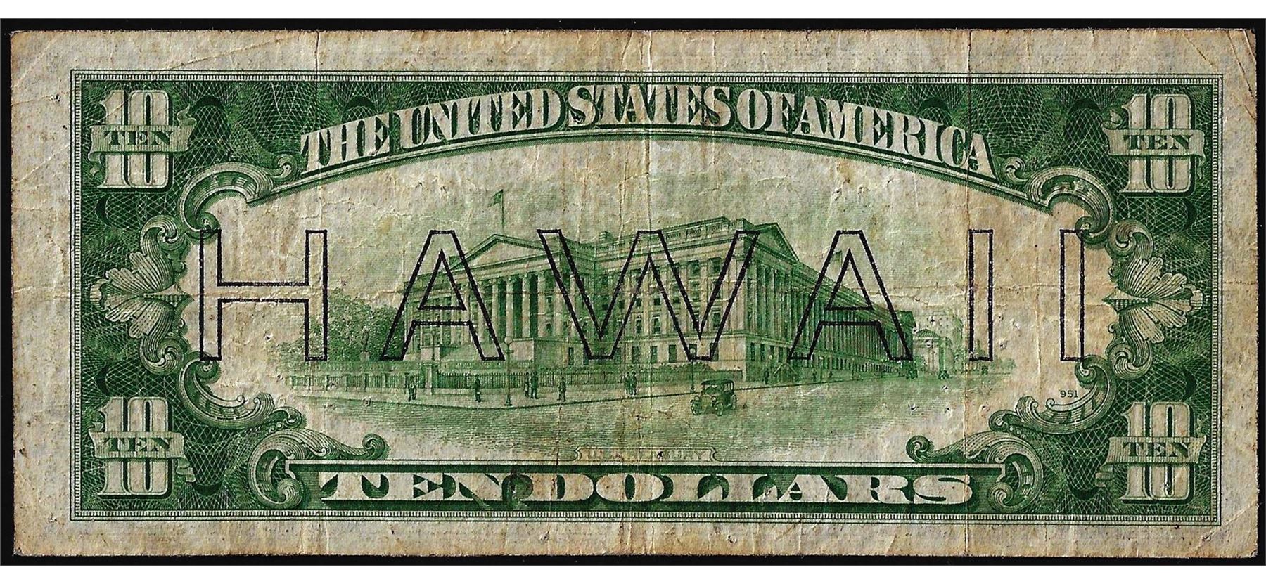 One 1934A $10 Hawaii WWII Emergency Issue Federal Reserve Note.