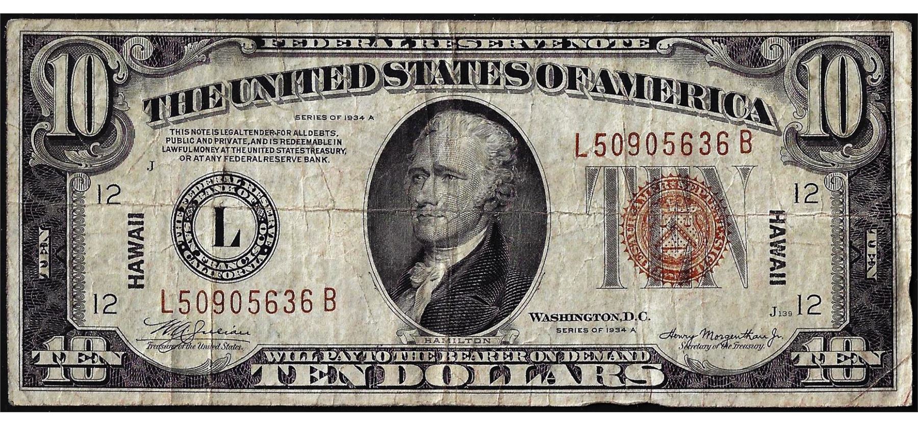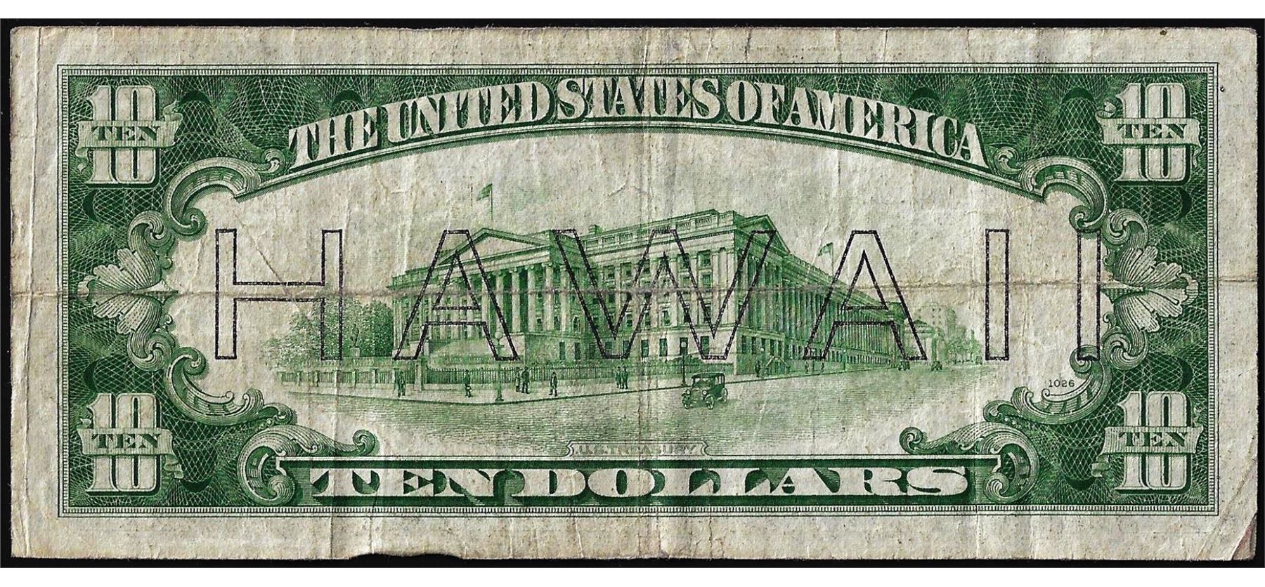 One 1934A $10 Hawaii WWII Emergency Issue Federal Reserve Note.