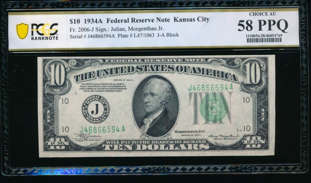 One 1934A $10 Kansas City FRN PCGS 58PPQ.