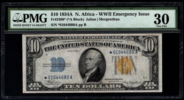 One 1934A $10 North Africa Silver Certificate STAR Note PMG 30.