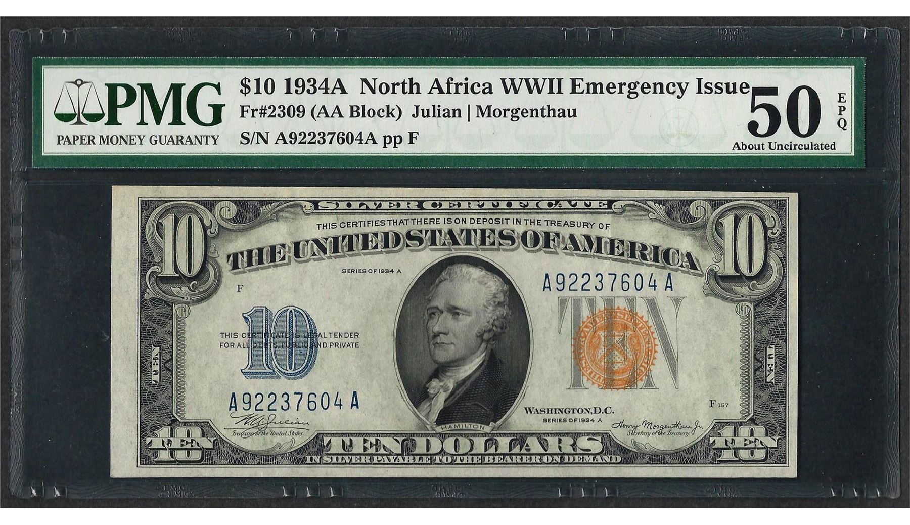 One 1934A $10 North Africa Silver Certificate WWII Emergency Note PMG About Unc. 50EPQ. PMG Certified.