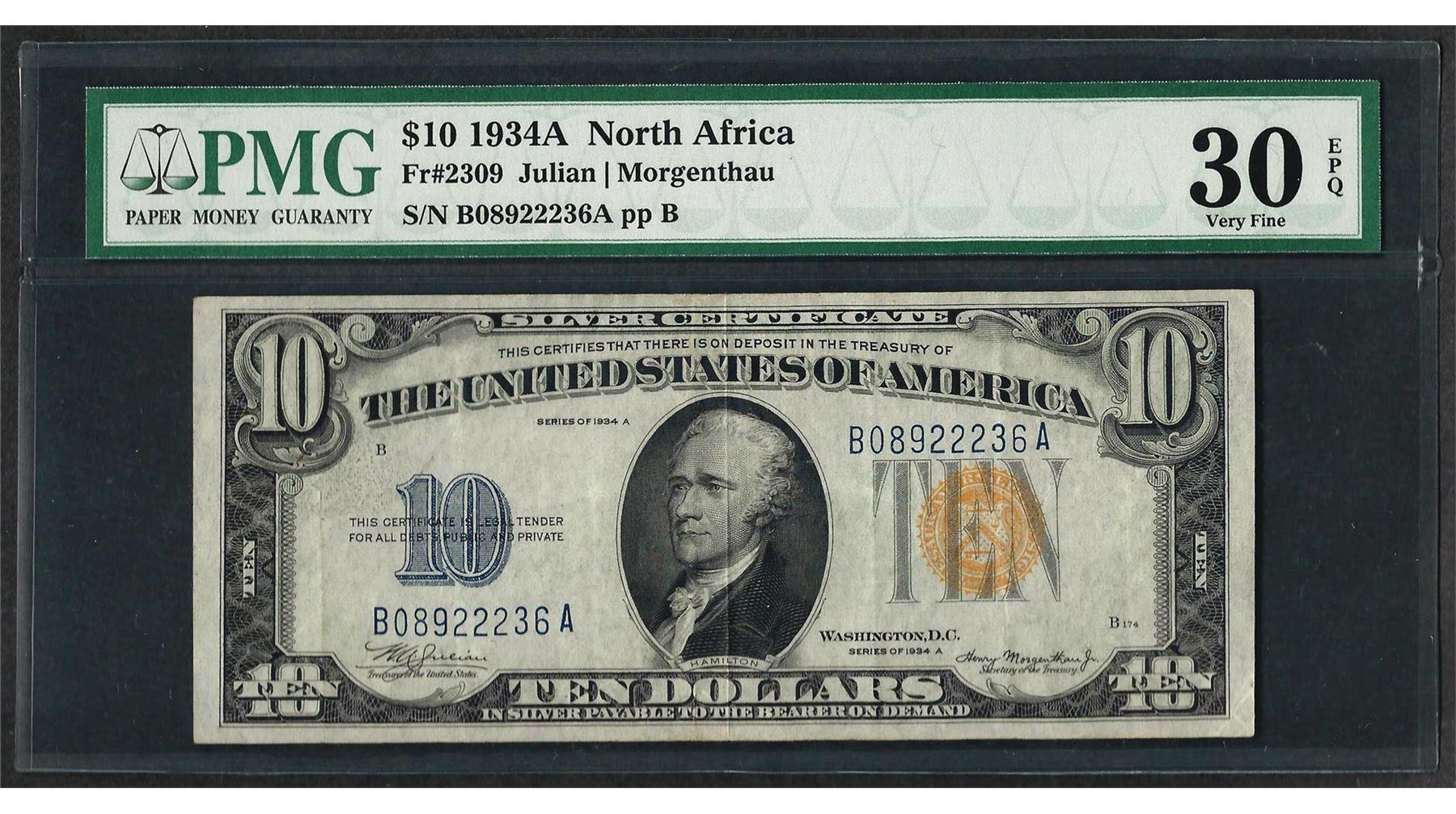 One 1934A $10 North Africa Silver Certificate WWII Emergency Note PMG Very Fine 30EPQ. PMG Certified.