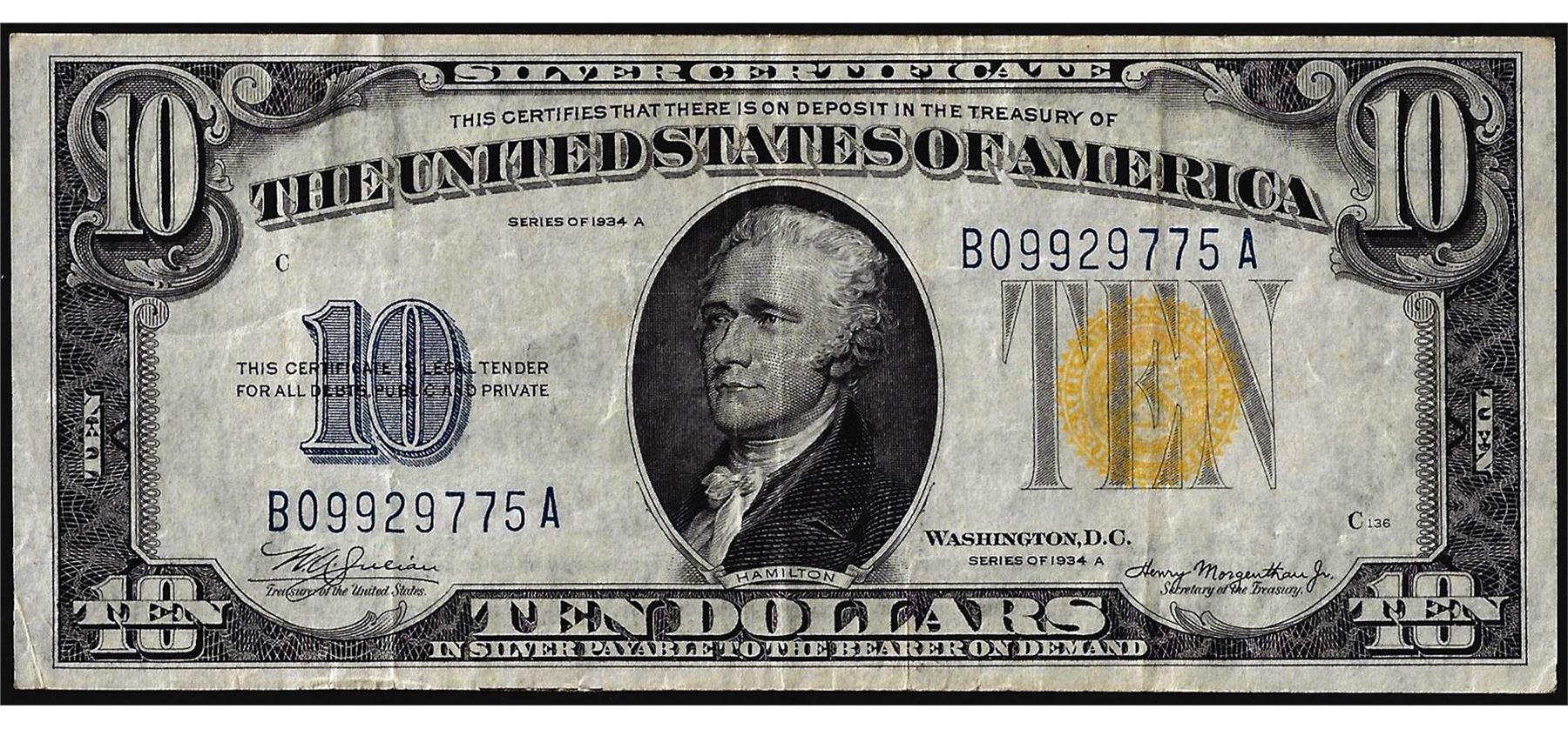 One 1934A $10 North Africa WWII Emergency Issue Silver Certificate Note.