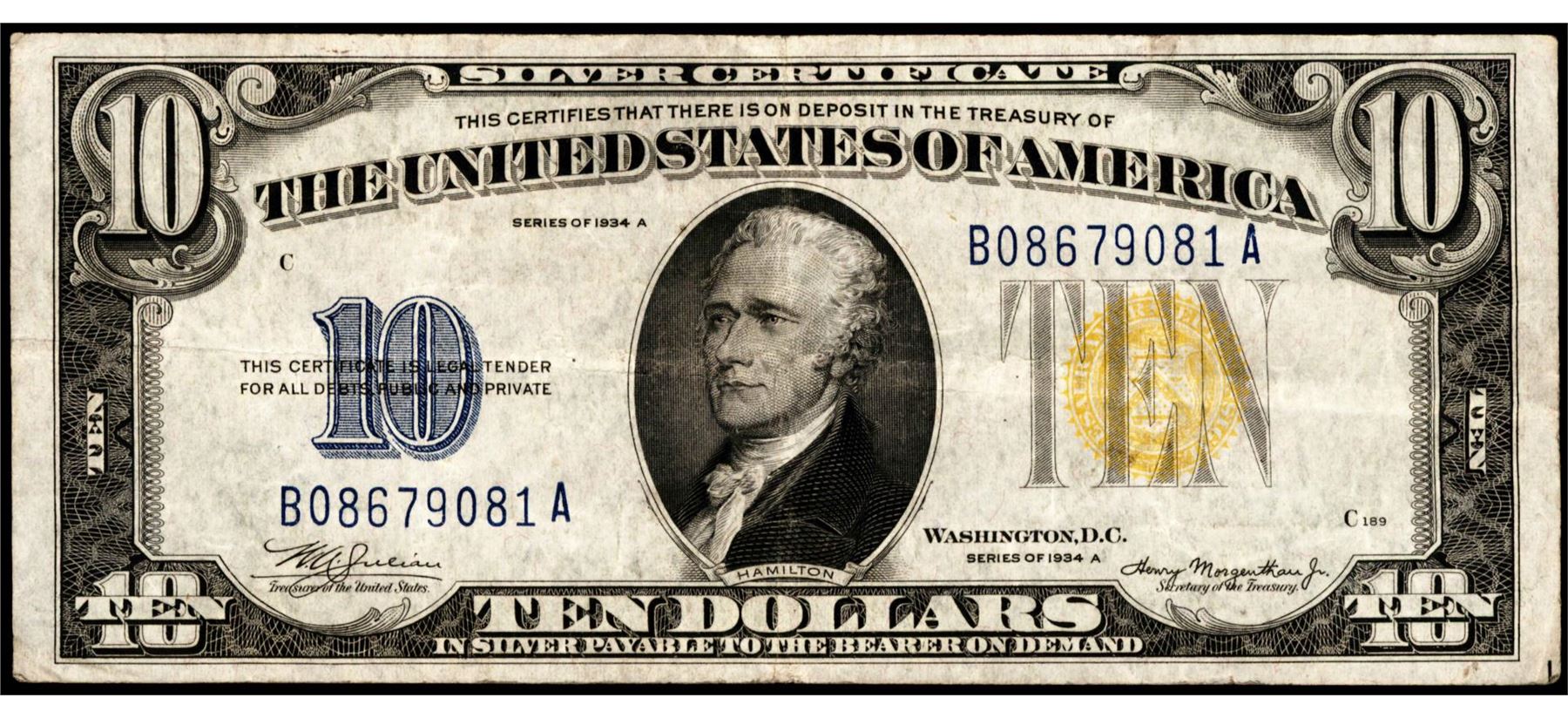 One 1934A $10 North Africa WWII Emergency Issue Silver Certificate Note.