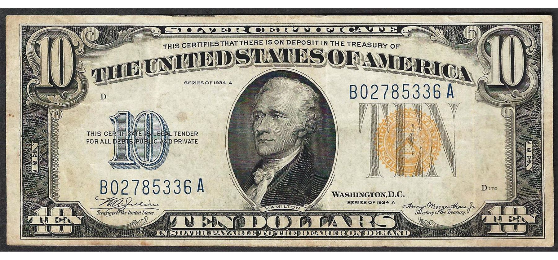 One 1934A $10 North Africa WWII Emergency Silver Certificate Note.