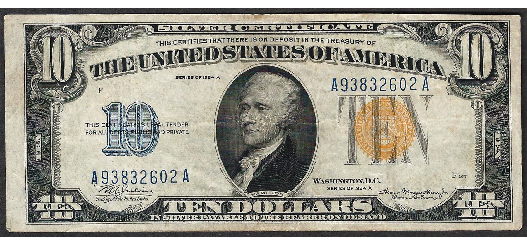 One 1934A $10 North Africa WWII Emergency Silver Certificate Note.