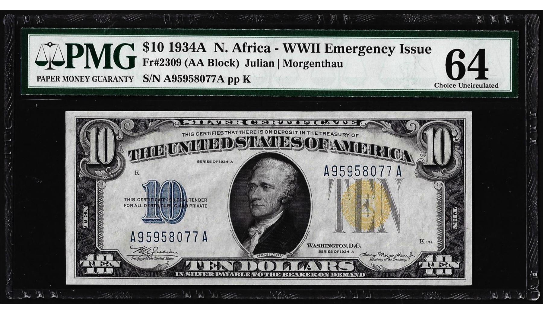 One 1934A $10 North Africa WWII Silver Certificate Note Fr.2309 PMG Choice Uncirculated 64. PMG Certified.