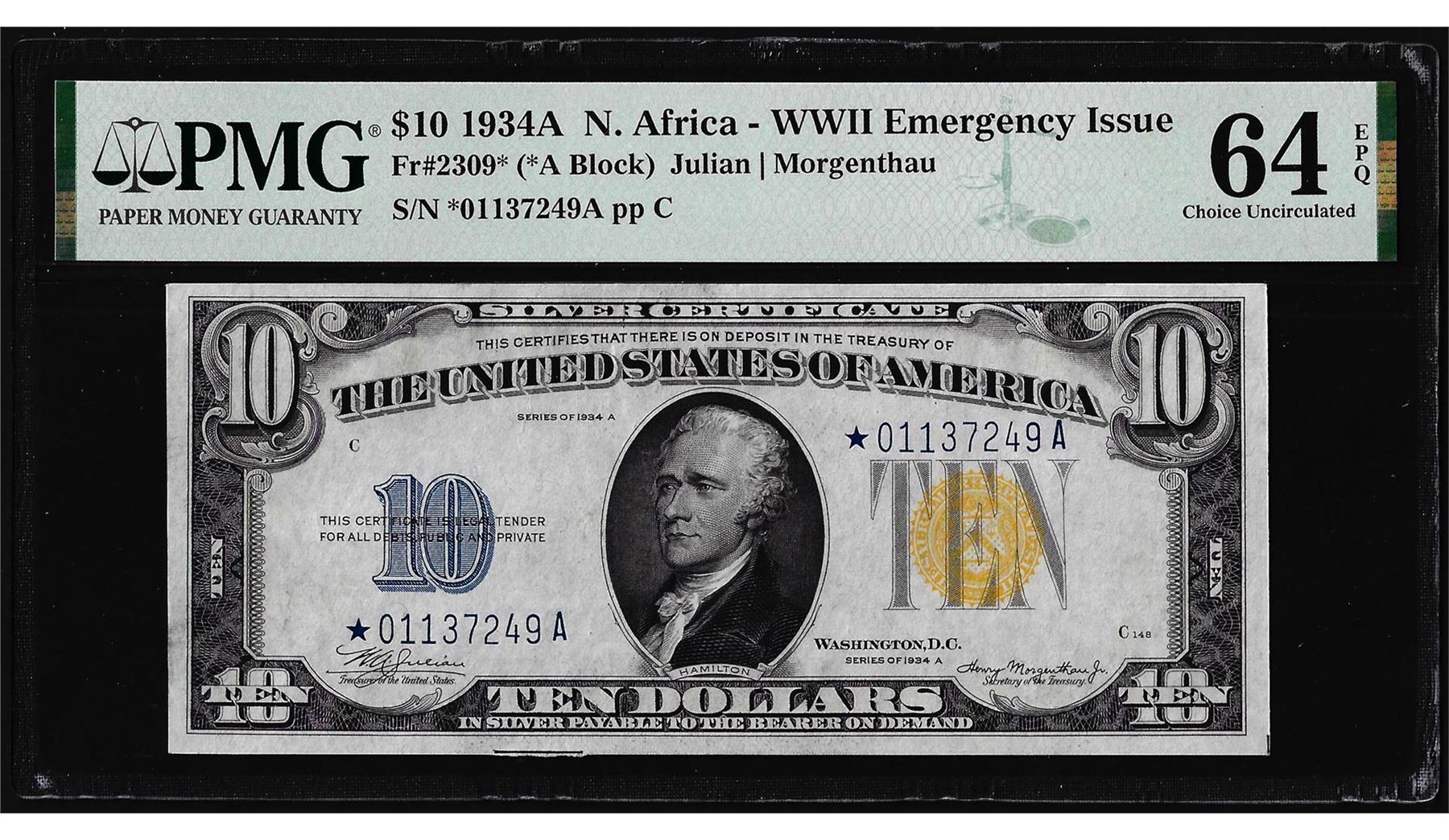 One 1934A $10 North Africa WWII Emergency Issue Silver Certificate Star Note Fr.2309* PMG Choice Uncirculated 64EPQ. PMG Certified.