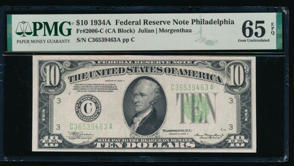 One 1934A $10 Philadelphia FRN PMG 65EPQ.