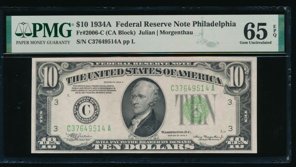 One 1934A $10 Philadelphia FRN PMG 65EPQ.