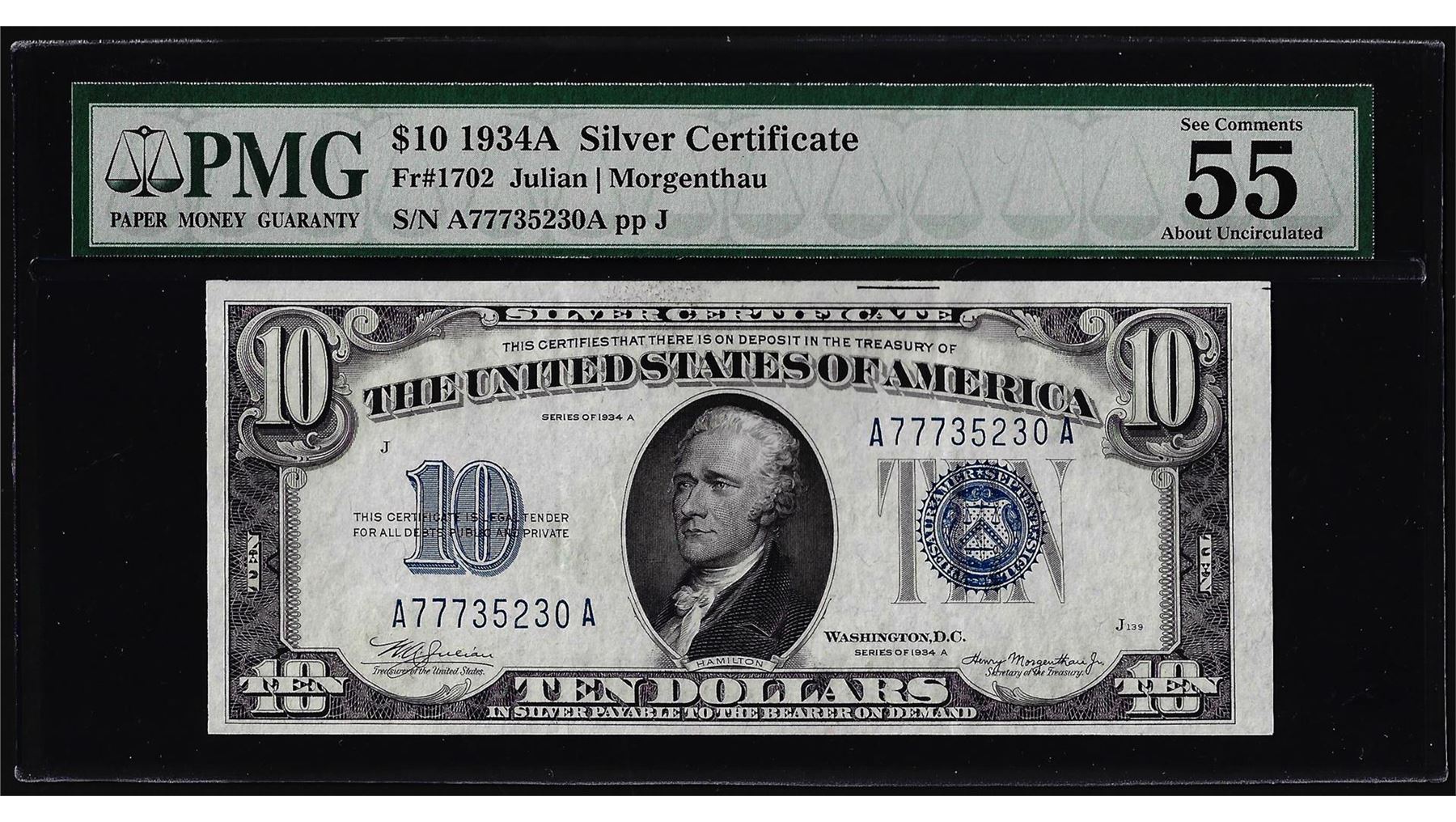 One 1934A $10 Silver Certificate Note Fr.1702 PMG About Uncirculated 55EPQ. PMG Certified.