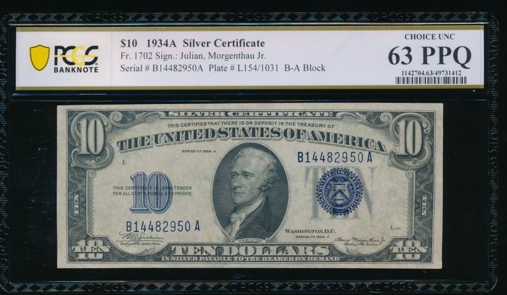 One 1934A $10 Silver Certificate PCGS 63PPQ.