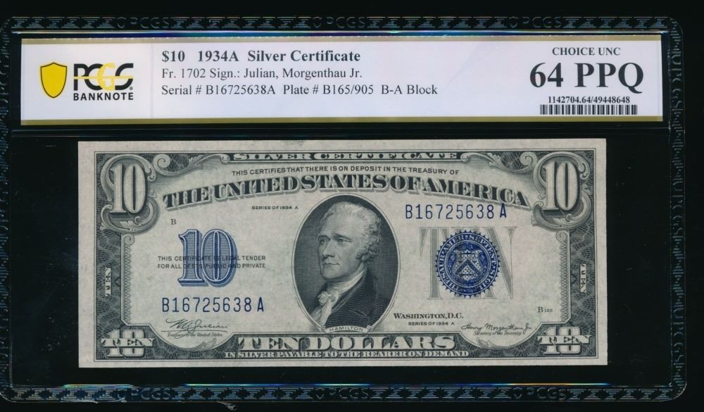 One 1934A $10 Silver Certificate PCGS 64PPQ.