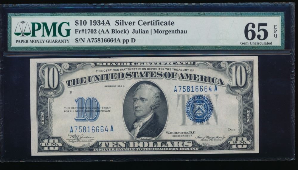 One 1934A $10 Silver Certificate PMG 65EPQ.
