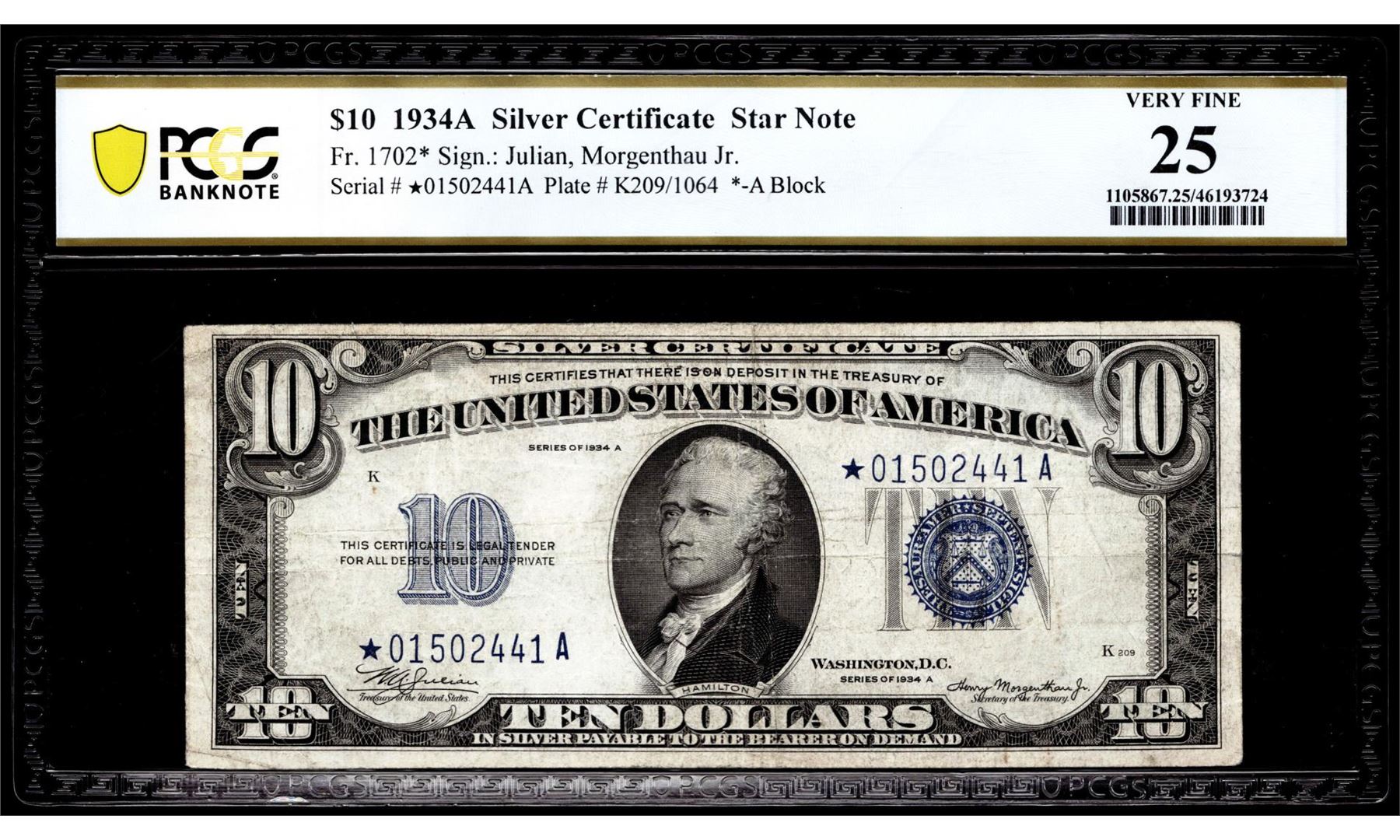 One 1934A $10 Silver Certificate STAR Note Fr.1702* PCGS Very Fine 25. PCGS Graded.