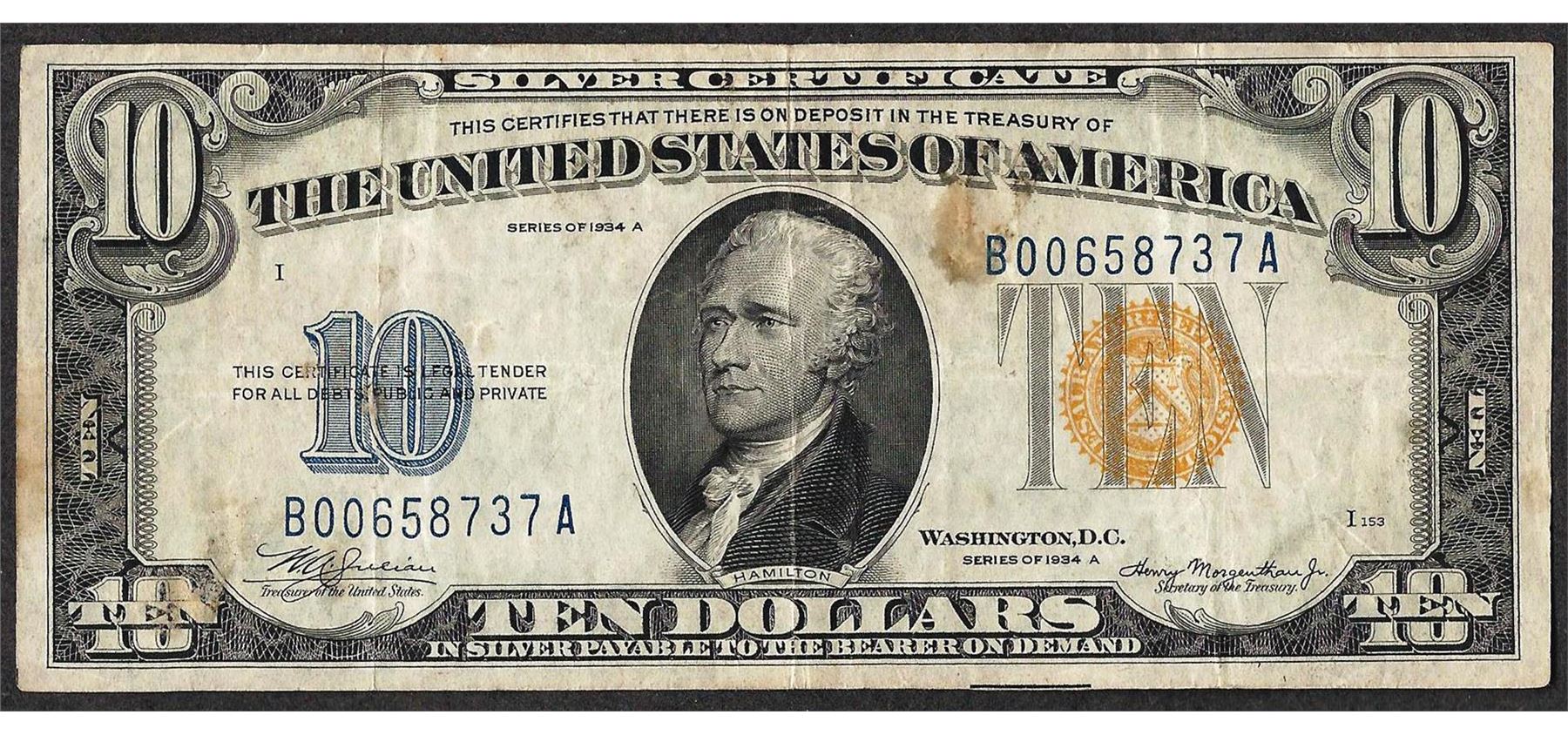 One 1934A $10 Silver Certificate WWI Emergency North Africa Note.