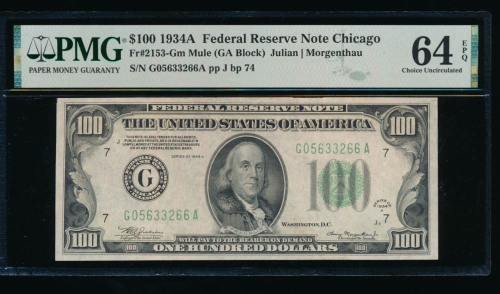 One 1934A $100 Chicago FRN PMG 64EPQ.