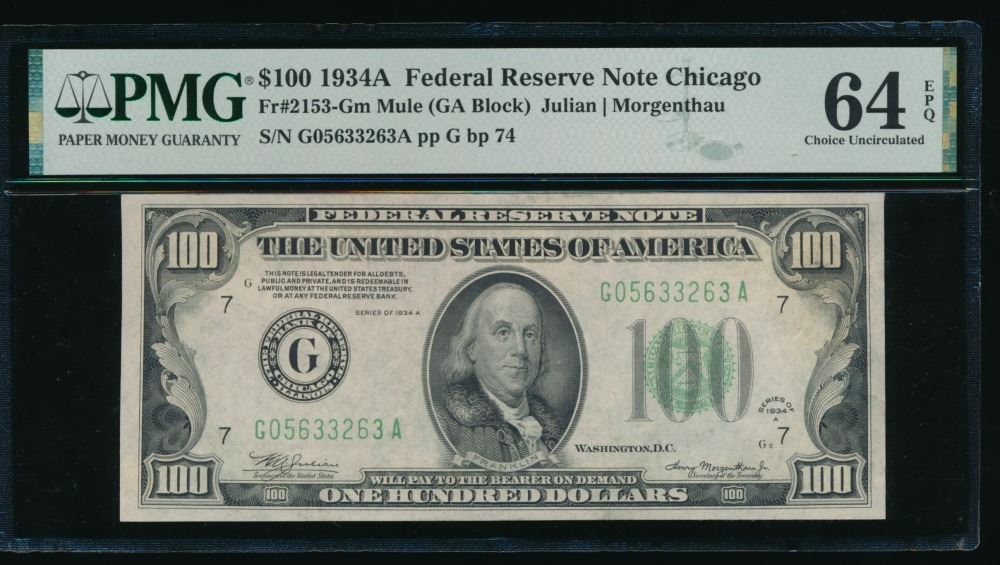 One 1934A $100 Chicago FRN PMG 64EPQ.