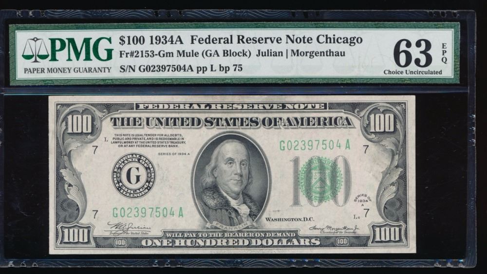 One 1934A $100 Chicago Federal Reserve Note PMG 63EPQ.
