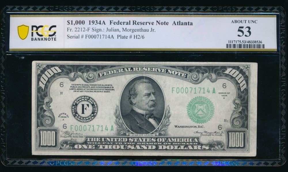 One 1934A $1000 Atlanta FRN PCGS 53.