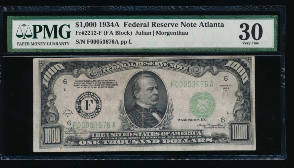 One 1934A $1000 Atlanta Federal Reserve Note PMG 30.