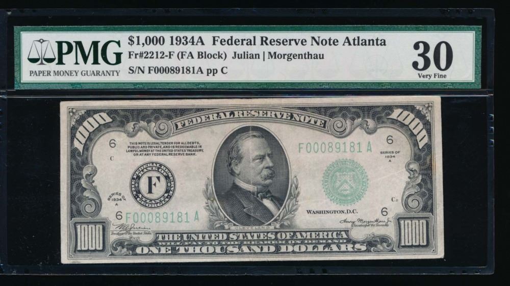 One 1934A $1000 Atlanta Federal Reserve Note PMG 30.