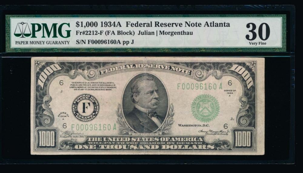 One 1934A $1000 Atlanta Federal Reserve Note PMG 30.