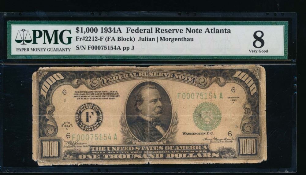 One 1934A $1000 Atlanta Federal Reserve Note PMG 8.
