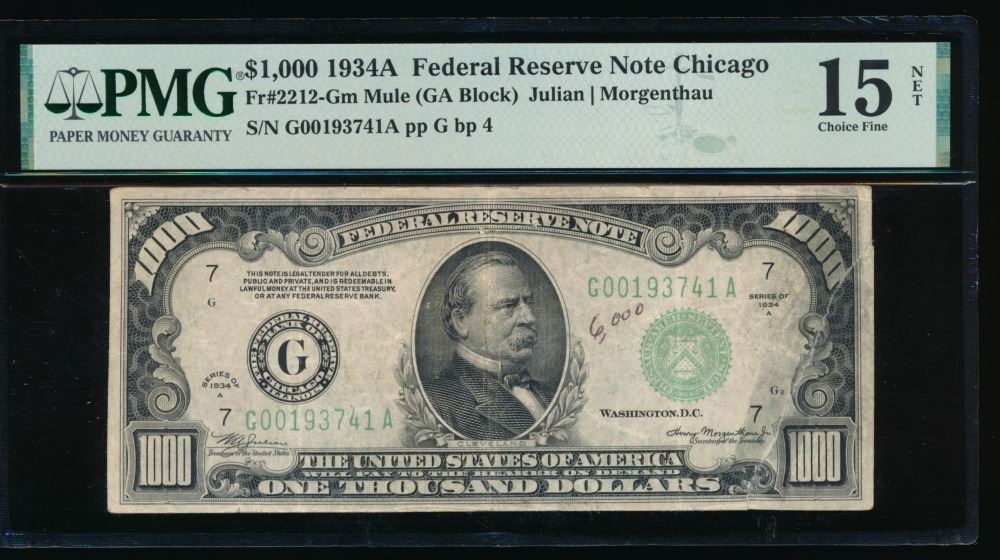 One 1934A $1000 Chicago FRN PMG 15NET.