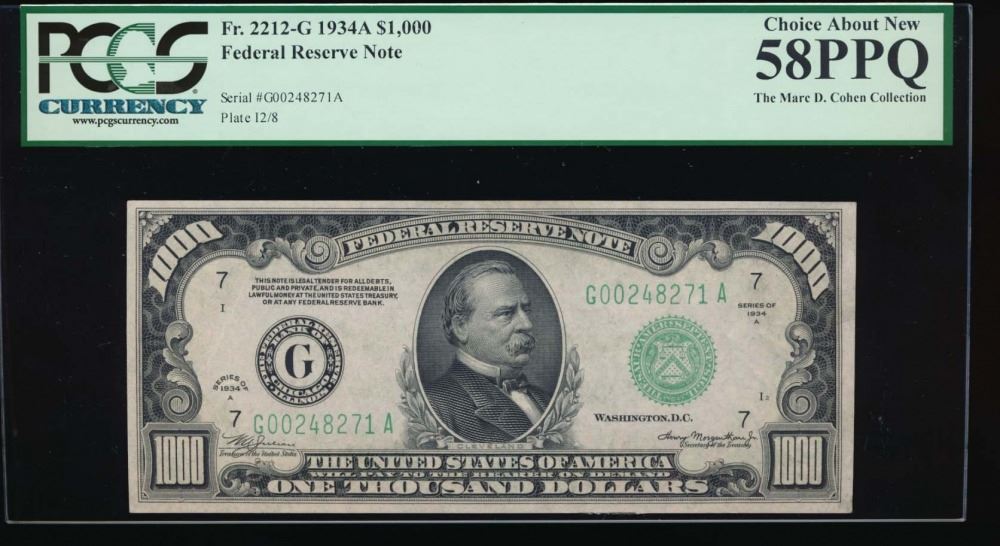 One 1934A $1000 Chicago Federal Reserve Note PCGS 58PPQ.