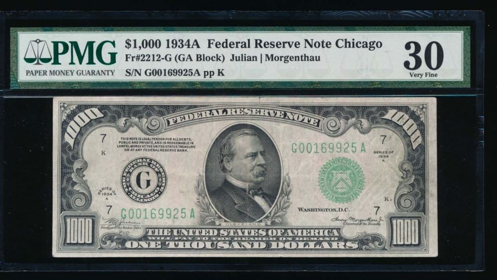 One 1934A $1000 Chicago Federal Reserve Note PMG 30.