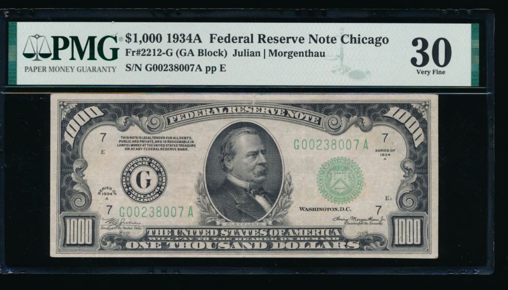 One 1934A $1000 Chicago Federal Reserve Note PMG 30.