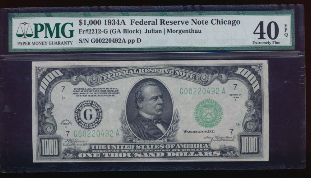 One 1934A $1000 Chicago Federal Reserve Note PMG 40EPQ.