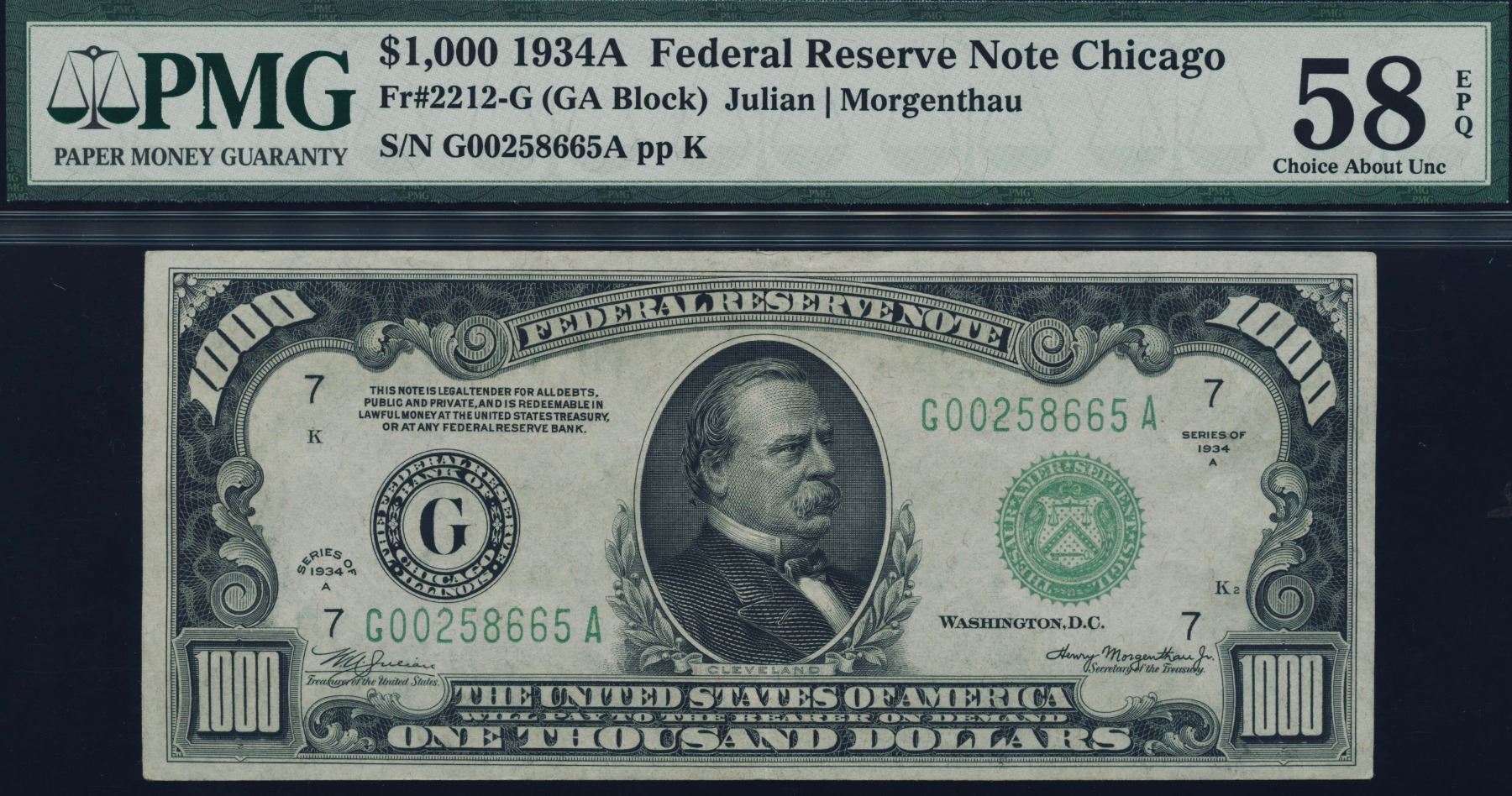 One 1934A $1000 Chicago Federal Reserve Note PMG 58EPQ.