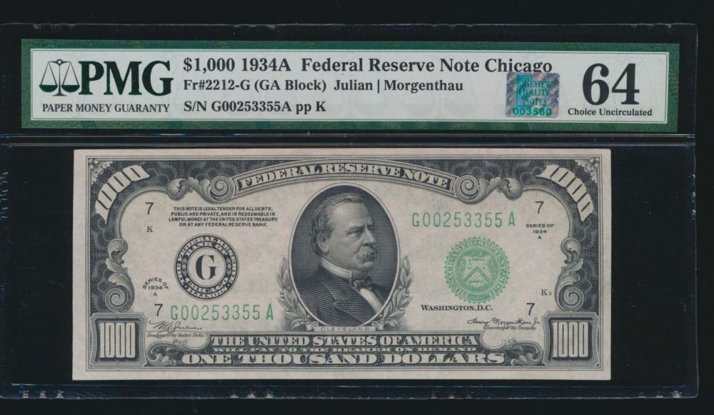 One 1934A $1000 Chicago Federal Reserve Note PMG 64.