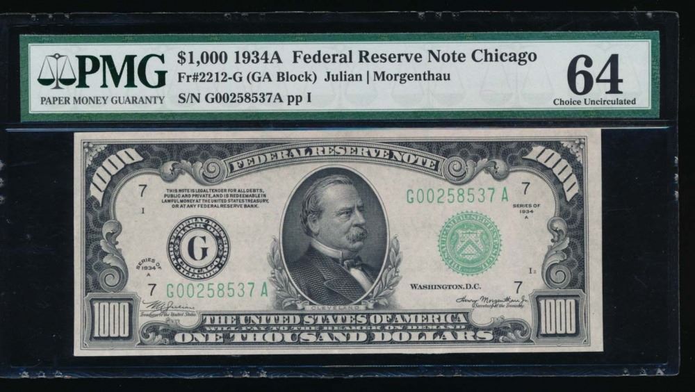One 1934A $1000 Chicago Federal Reserve Note PMG 64.