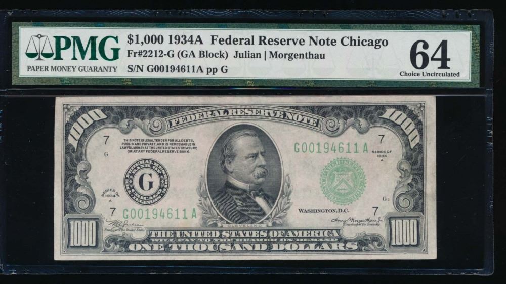 One 1934A $1000 Chicago Federal Reserve Note PMG 64.