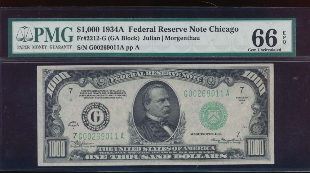 One 1934A $1000 Chicago Federal Reserve Note PMG 66EPQ.