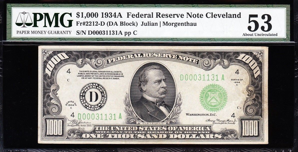 One 1934A $1000 Cleveland Federal Reserve Note PMG 53.