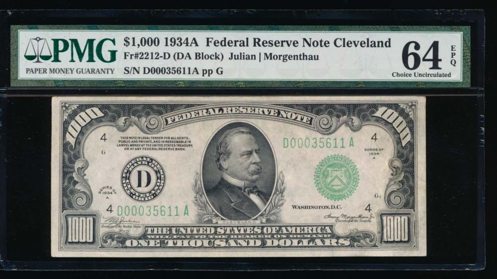 One 1934A $1000 Cleveland Federal Reserve Note PMG 64EPQ.