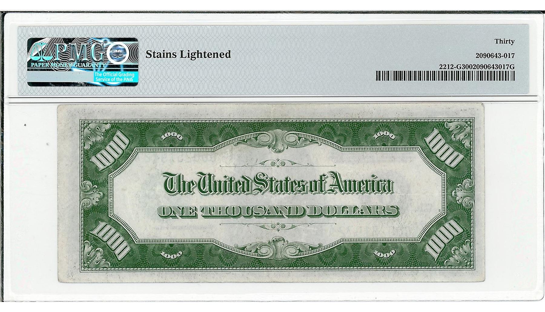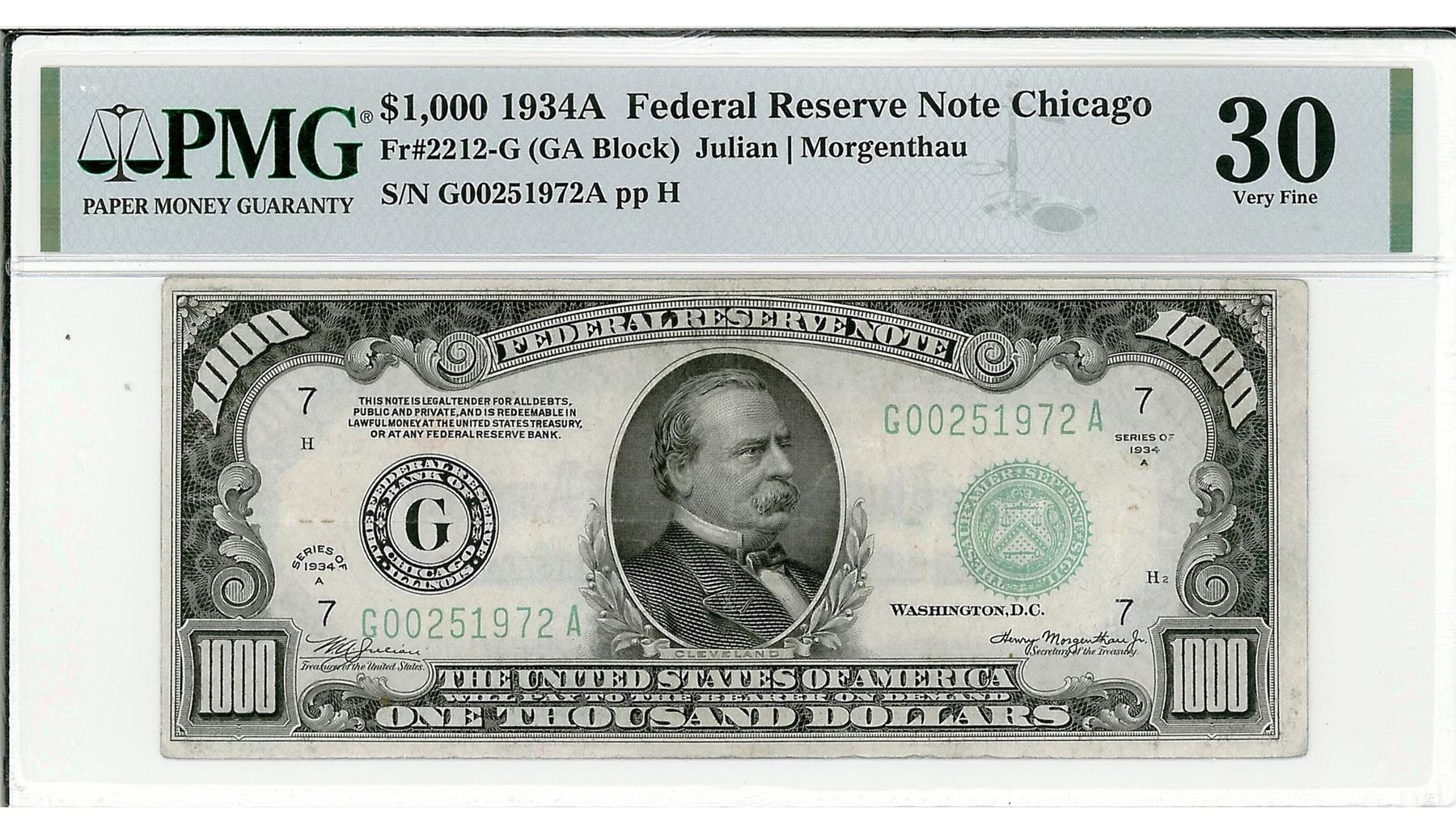 One 1934A $1000 Federal Reserve Bank Note Chicago PMG 30 Very Fine. The serial number is 251972.