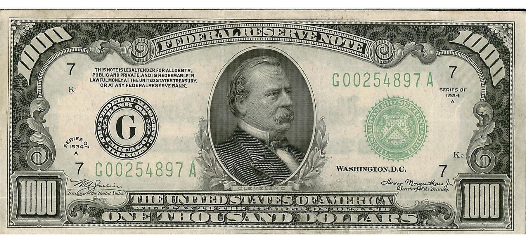 One 1934A $1000 Federal Reserve Bank Note Chicago. The serial number is 254897.