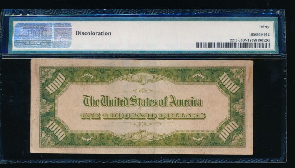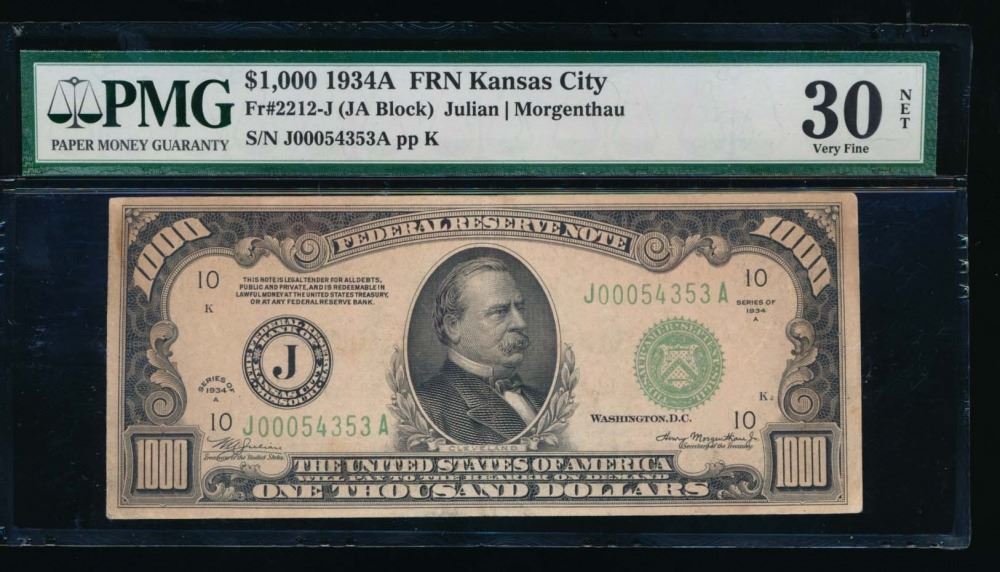 One 1934A $1000 Kansas City Federal Reserve Note PMG 30NET.