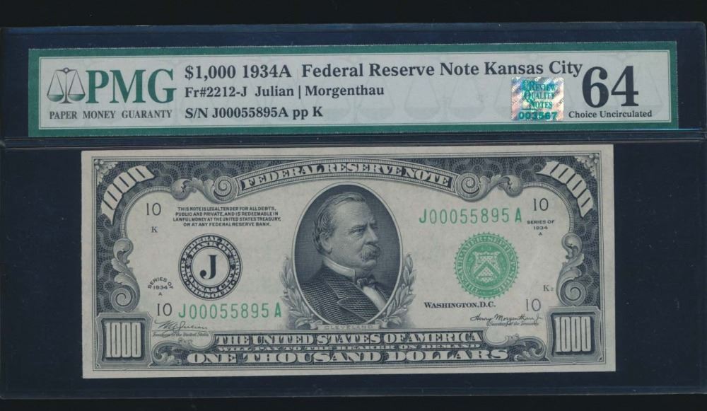 One 1934A $1000 Kansas City Federal Reserve Note PMG 64.