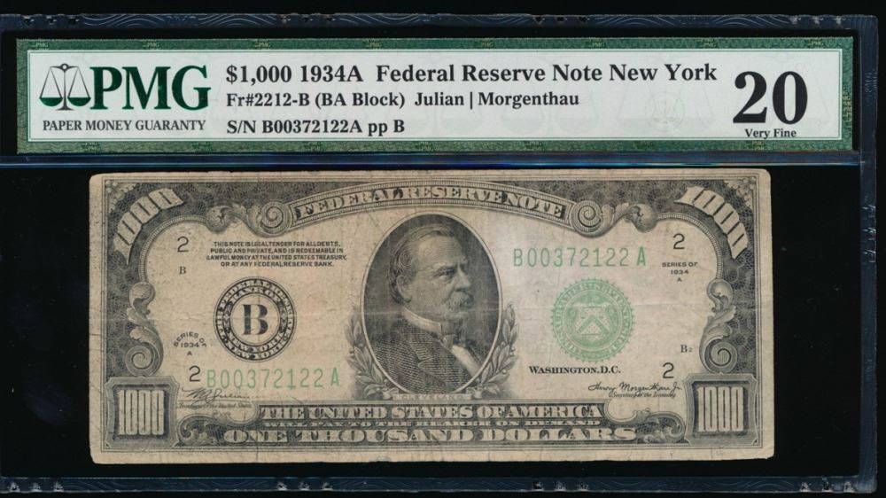 One 1934A $1000 New York Federal Reserve Note PMG 20.